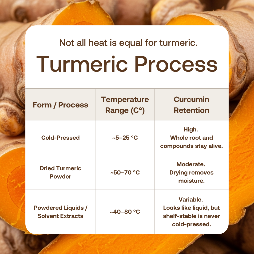 Most turmeric pills and powders are hard to absorb — and often stripped of key compounds through heat processing. Research shows that whole turmeric in food form is absorbed more effectively than isolated curcumin supplements (Nutrition Journal, 2014).